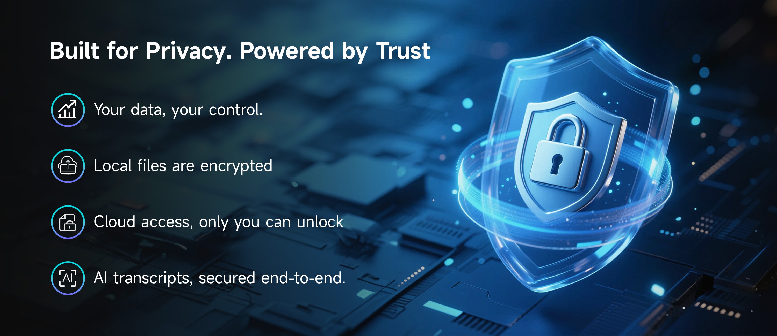 - Your data is encrypted and private. Enjoy 64GB of built-in storage (up to 434 hours of recording) and unlimited encrypted cloud storage. The sleek, lightweight design (only 29g) is effortlessly portable.